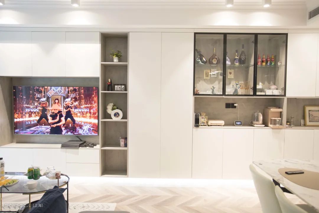 毛毛家把原来玄关的隔断墙打掉,用整墙储物柜连接客厅、餐厅和玄关,储物能力超强,视觉上更统一。