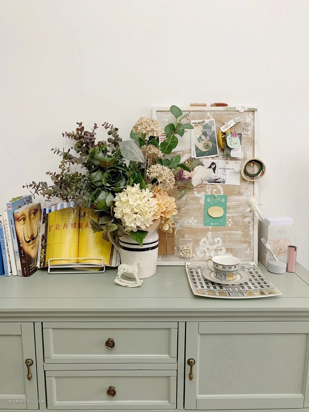 沙发正对面是复古田园风情的餐边柜布景,细节处都是居家小心思,比如花瓶旁边书籍的插页,根据季节变化来装饰,采访时正是浓浓秋意的氛围。