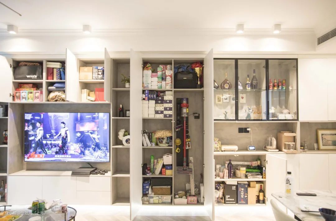 电视柜区域用作展示的开放格比较多,电视上方和旁边的柜体储物容量很大。