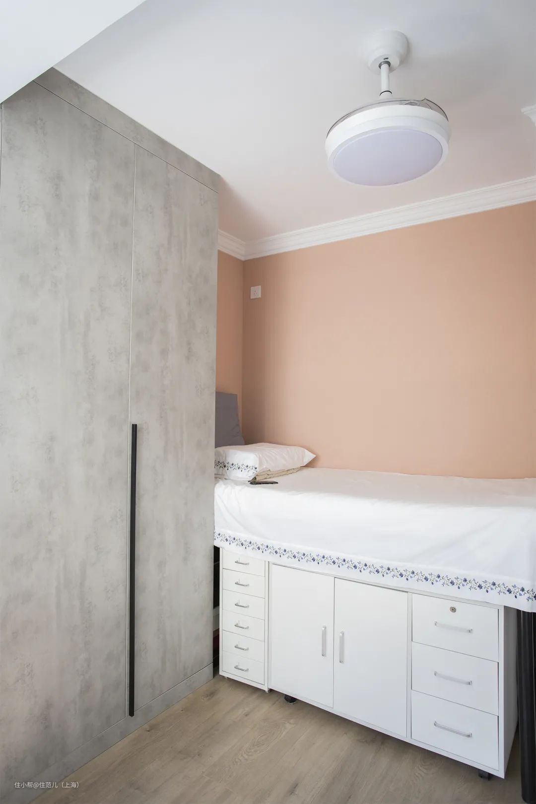 灰粉半墙的墙漆分色线,和定制衣柜双色柜门的腰线高度一致,这种延续的横线条,可以让狭小房间感觉更“显宽”一点。