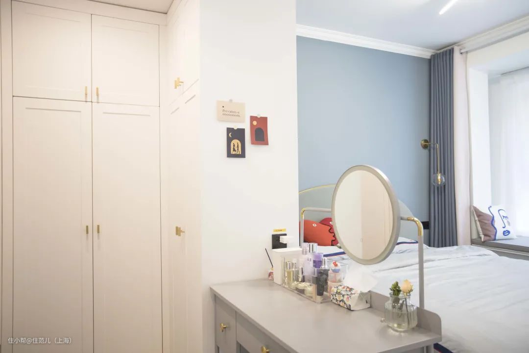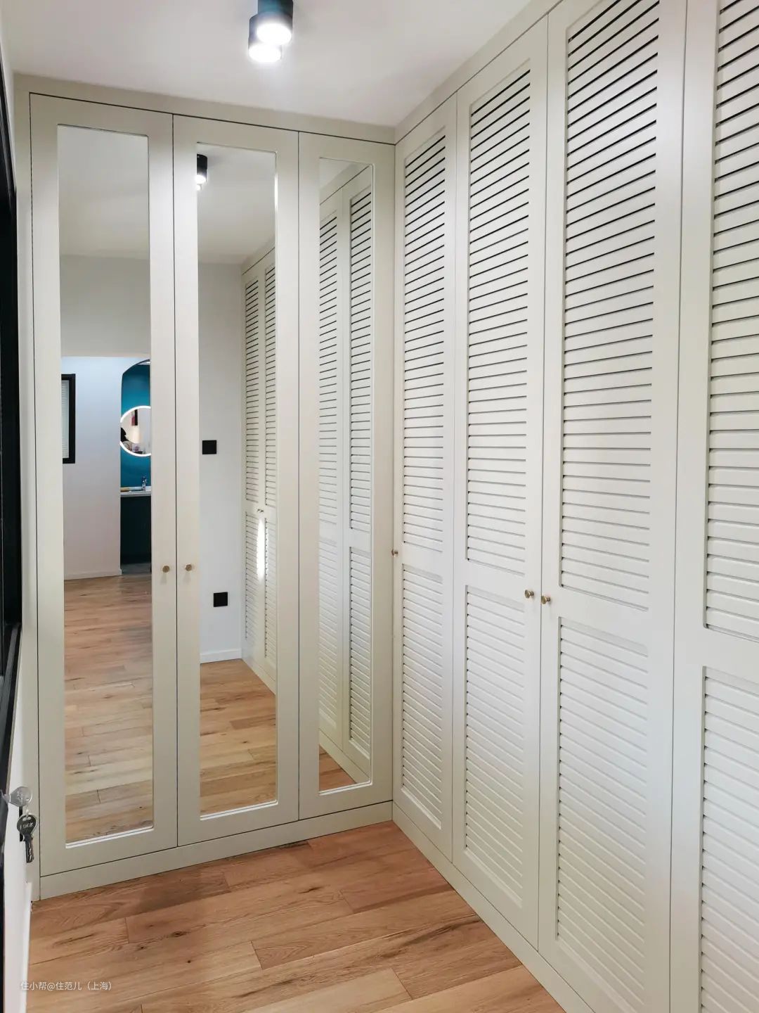 还有一个显大的细节,就是在通体米白色的衣帽间门板中嵌入了镜面,让空间大大拉伸。
