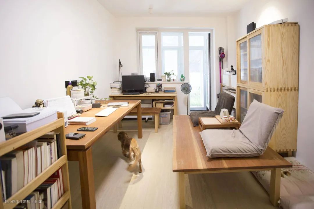 大书桌、长凳等几个大件儿构成了这个复合型的书房 / 客厅: