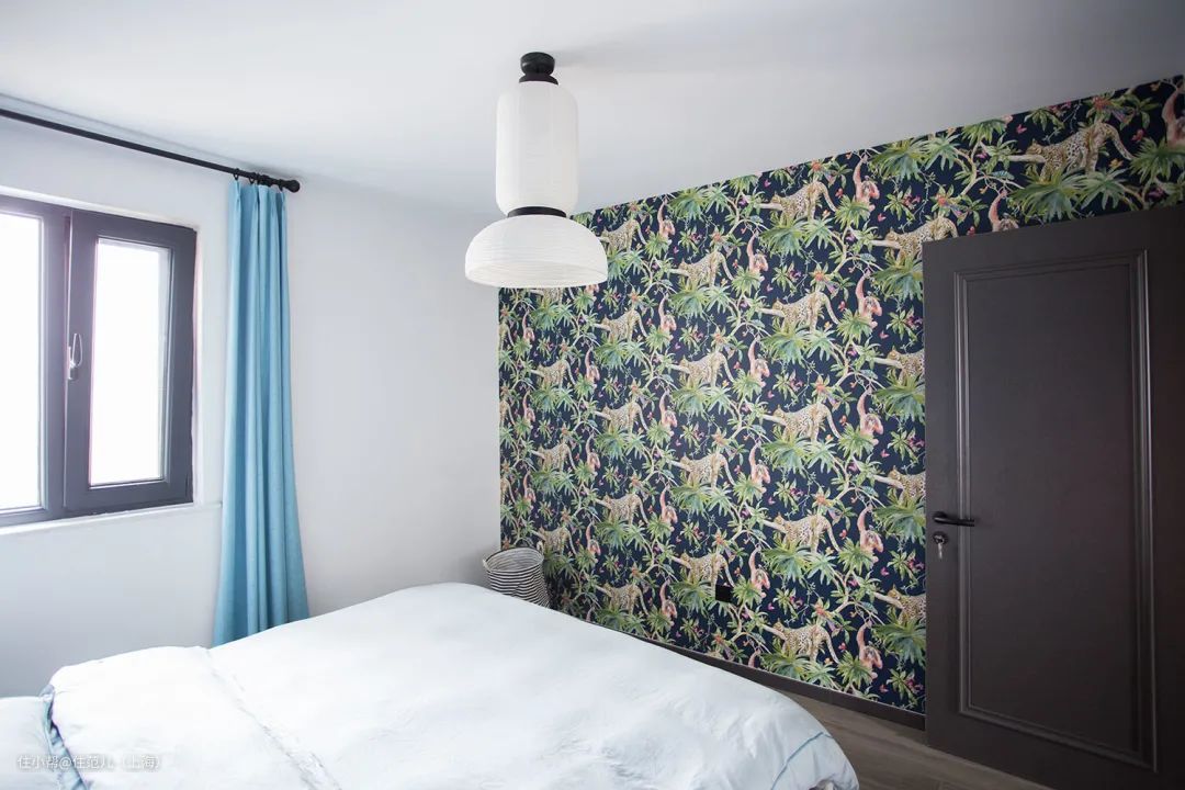 床对面的墙延续了餐厅同品牌和风格的壁纸装饰,以绿植和动物花纹为基底,增添了一丝灵动的趣味,象牙白色的北欧风吊灯,中和了整体色调和质感。