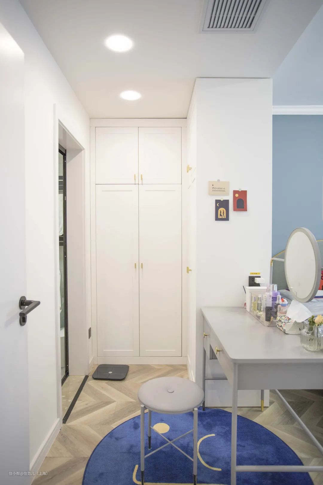 主卧一进门也是L型的通顶柜打造的步入式衣帽间,扩容的同时,很好的改善了之前主卫正对着卧室的尴尬。