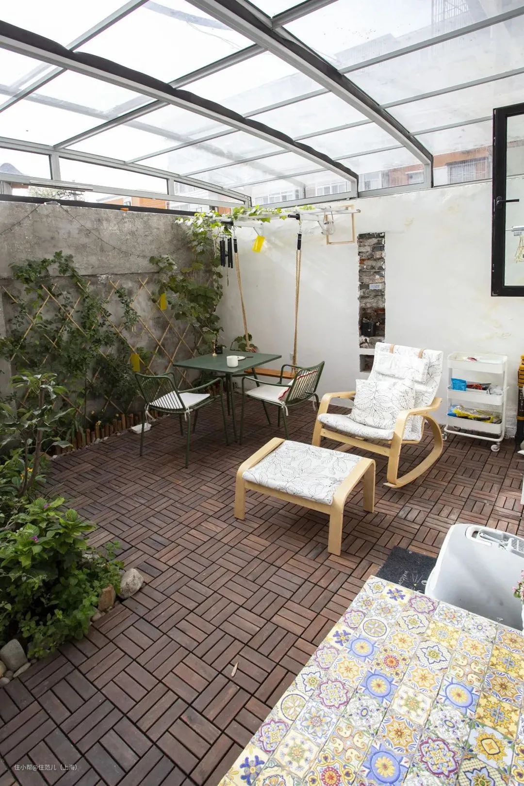 Annie家的这个小院,曾被之前的屋主封起来做了次卧,Annie重新罩上一层透明的防水屋顶,打造了半户外庭院,名为“周小花园”。