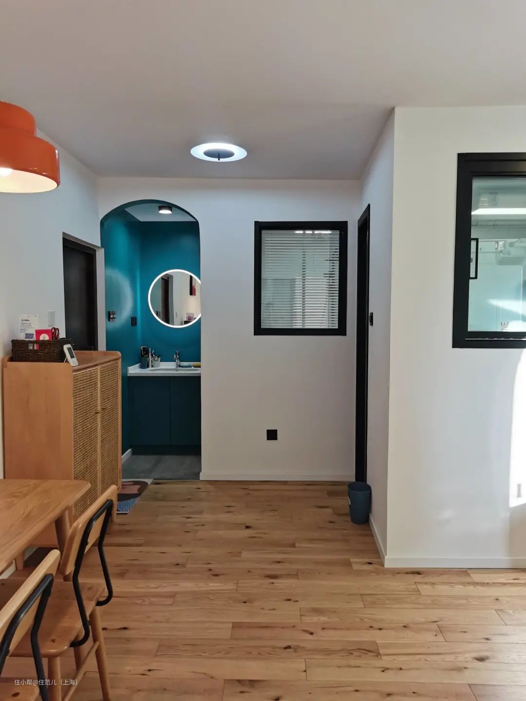 本身采光不太好的暗卫,在墙面上也设计了室内窗,与旁边干区的拱门在空间上饶有趣味的呼应,考虑到隐私问题,安装了百叶窗,好看又实用。