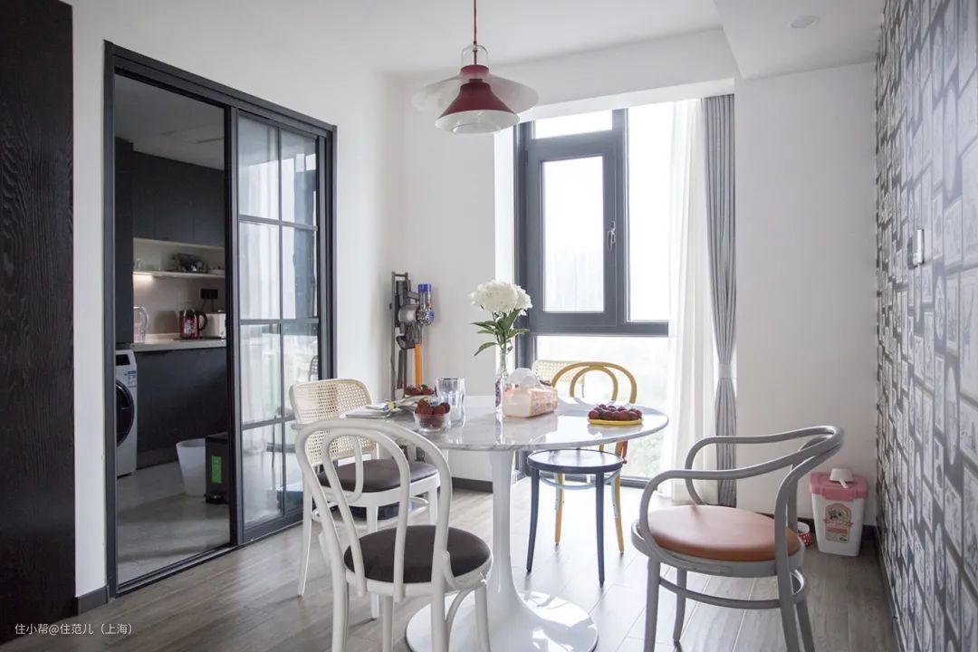家里的桌椅全是Aima精挑细选的,捷克品牌TON餐椅,搭配大理石纹餐桌和樱桃红略复古的丹麦Normann艺术吊灯,整个空间装饰性很强。