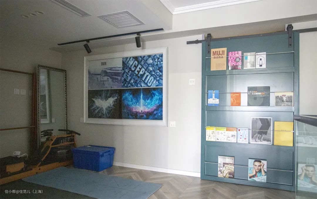楼上健身区旁边定制了谷仓门,像国外家居流行的那样,门扇表面设计成多层可置物的样式,不单作为一扇推拉门,而是赋予更丰富的收纳功能。