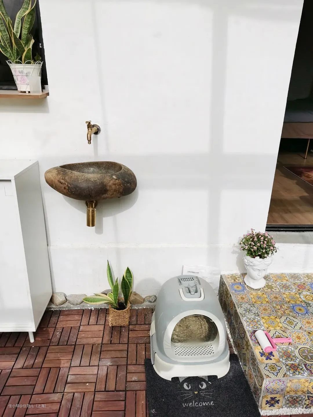 闲鱼搜罗来的二手浴缸摆在侧边,平时放上水,养着水草和小金鱼,鹅卵石的小洗手池和黄铜水龙头,透露出浓郁的复古感。