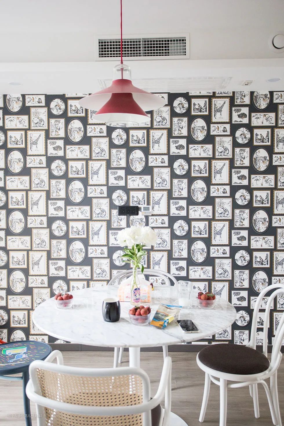 屋主二人都非常喜欢有动物图案在艺术审美元素,整面餐厅背景墙也延续自然简约的黑白格调,定制了英国品牌的动物彩绘艺术壁纸。