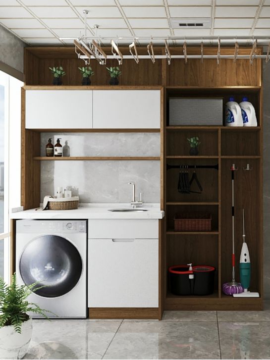 台面下嵌入洗衣机,上方设计收纳吊柜与开架,增设水池柜实用好看