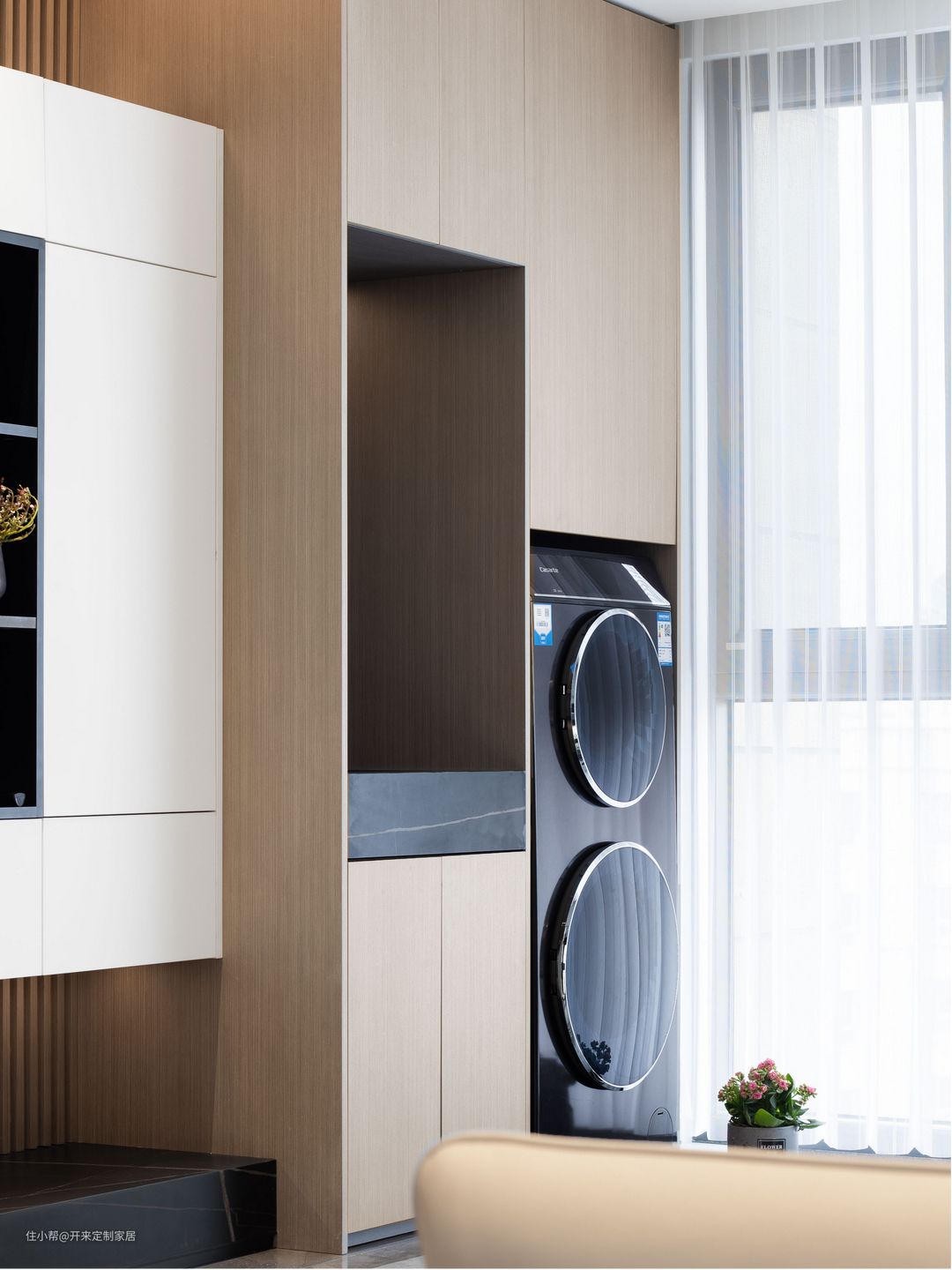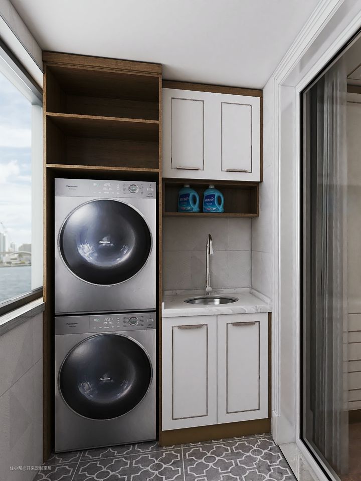 洗衣机柜错层打造嵌墙洗烘叠加柜与水池柜——