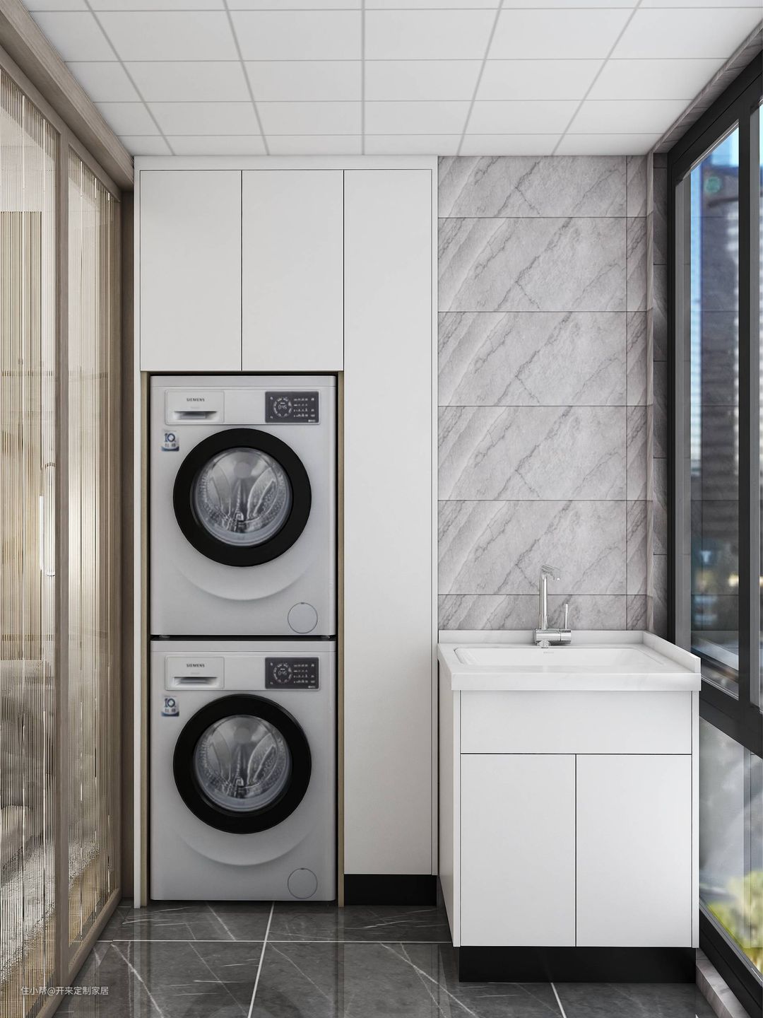 洗衣机柜星空灰一体色柜+隐形内扣拉手,水池柜可根据家庭需求设计