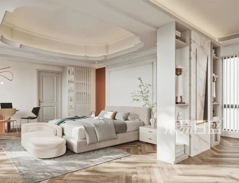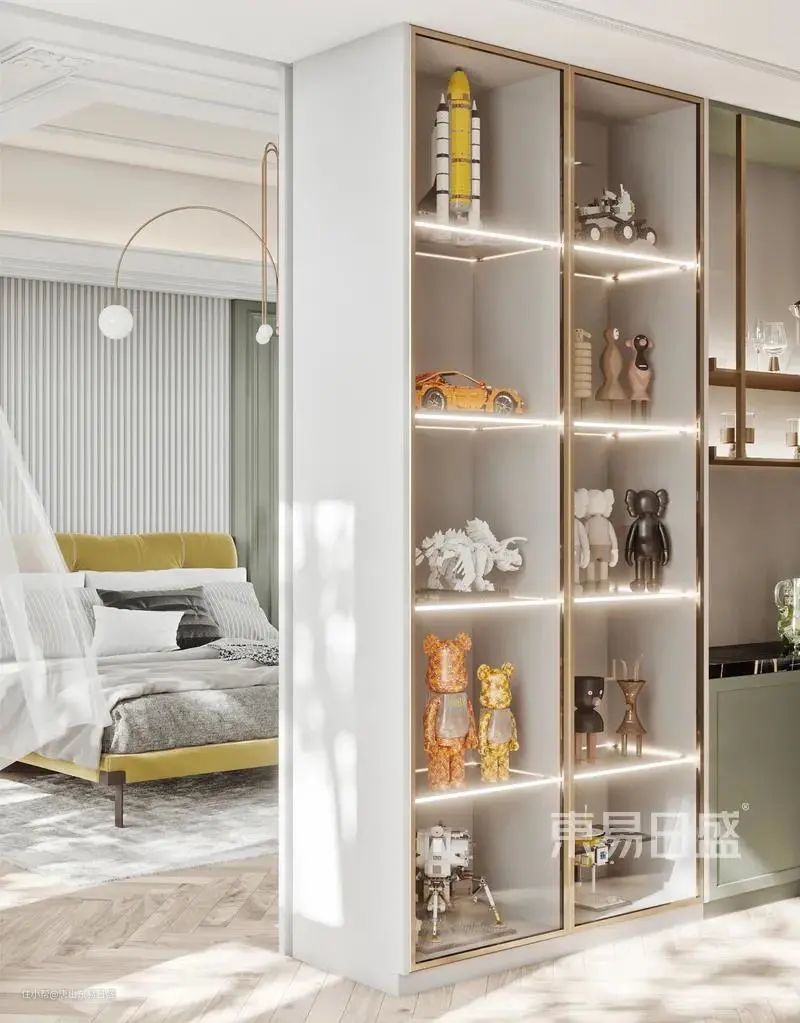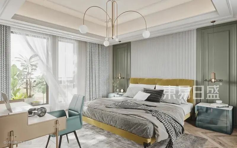 不同的卧室有着不同的主色调,无论是清新的绿色,还是柔软的珊瑚色,抑或是怡人的明黄,都以不同的方式为空间注入暖意。细腻温润的护墙板作为床头背景,散发着淡淡的法式风情,mini吧和起居功能的完善,增加了空间的便捷度。