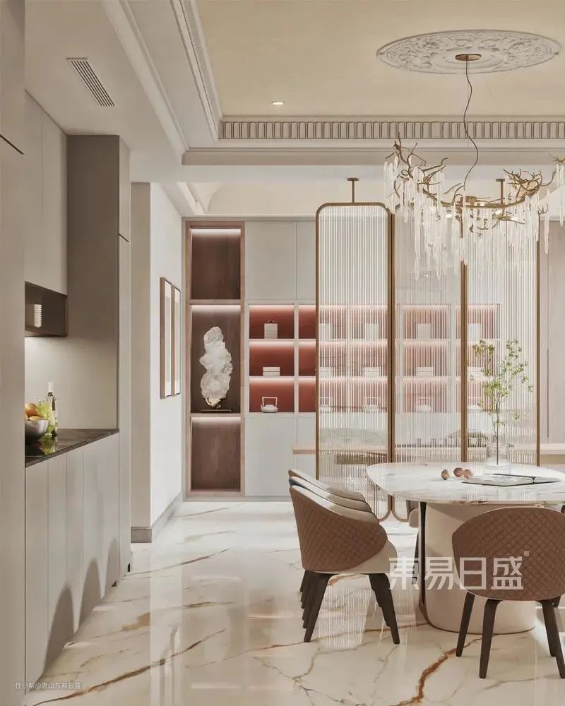在这个“越简约越高级”的当代审美下,法式风格和这种审美恰恰相反。华丽的水晶灯,复古的墙面装饰和雕花,再加上现代的家具,恰到好处的复古华丽,又时髦耐看。