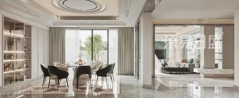 这个餐厅设置在休闲区域,旁边的餐边柜设计洁白简约,方便顺手放取物品。餐桌虽不如前者大气,但足够雅致大方,亲朋在此小聚不是问题。
