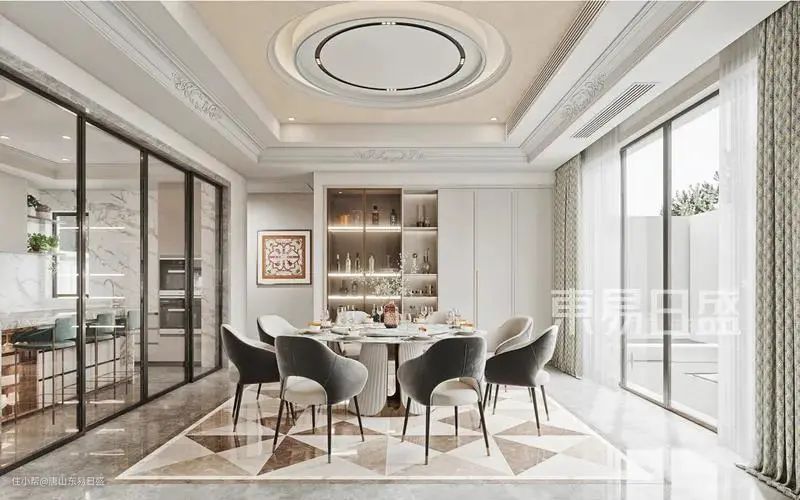 法式餐厅推崇优雅、高贵和浪漫,这是一种基于对理想情景的思考。此处采用大型圆形餐桌,靠椅紧贴四周,提供充足的落座空间。两侧的落地窗设计,让光线畅通无阻地流淌在每一个角落,通透感十足。