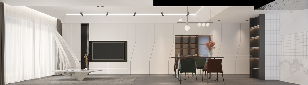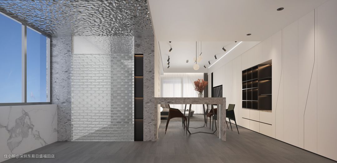 2、整体采用无主灯设计,踢脚线也被金属代替,空间自上而下流畅一体,营造统一序列感,扩大空间视觉。