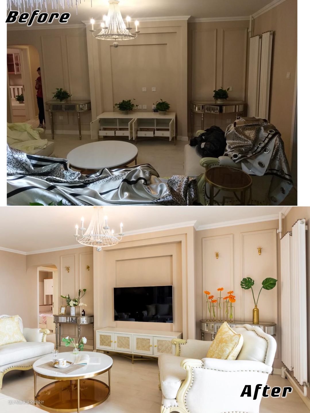 客厅里闪亮元素(镜面、水晶、贝壳、金银色)的大量运用,制造多处空间高光点,分散了沙发的敦实感。华丽的做旧端景台、电视柜就是典型代表,颜值不但高而且能储物。