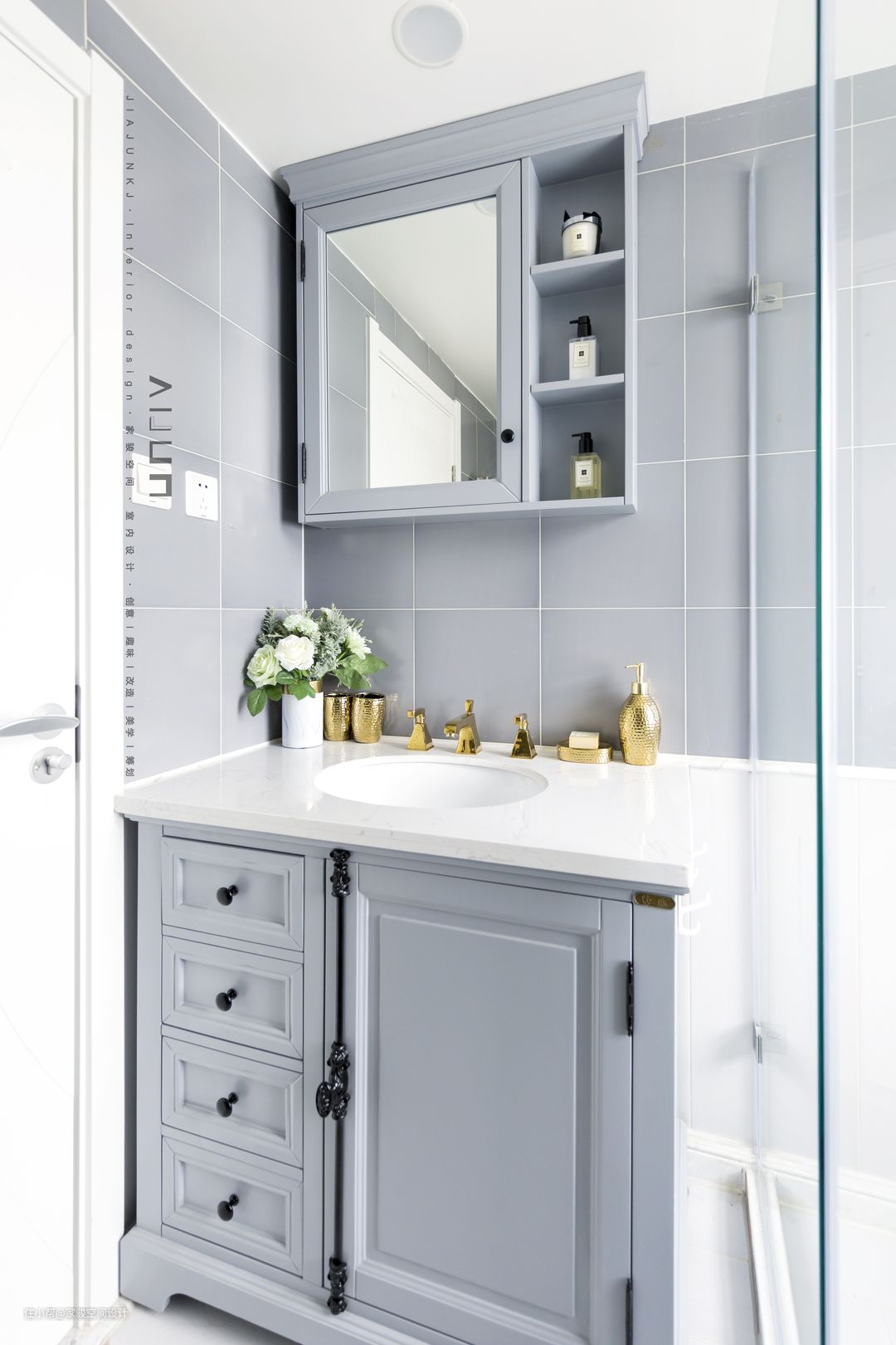 淡蓝色复古浴室柜细节丰富,清爽干净,放置了金色摆件,和客餐厅风格统一。