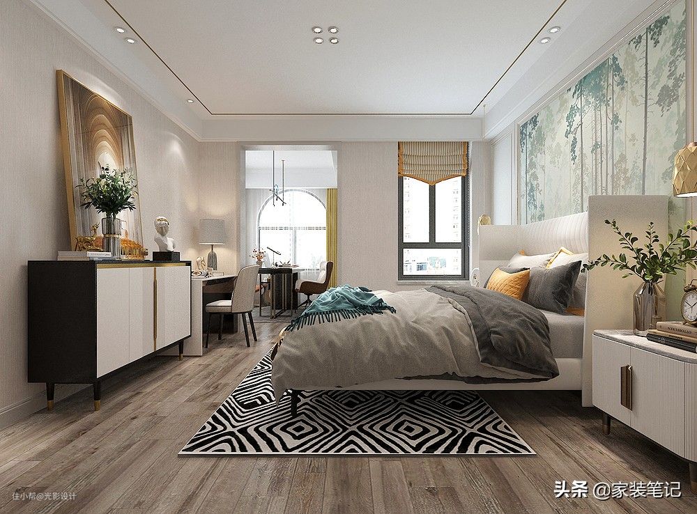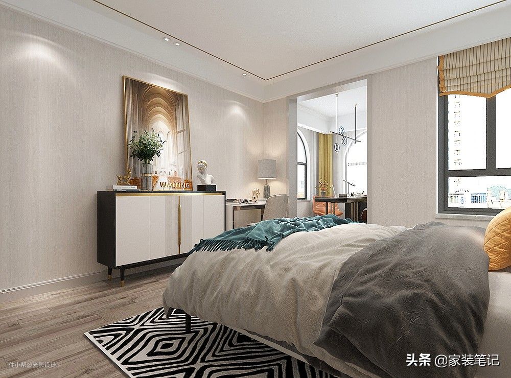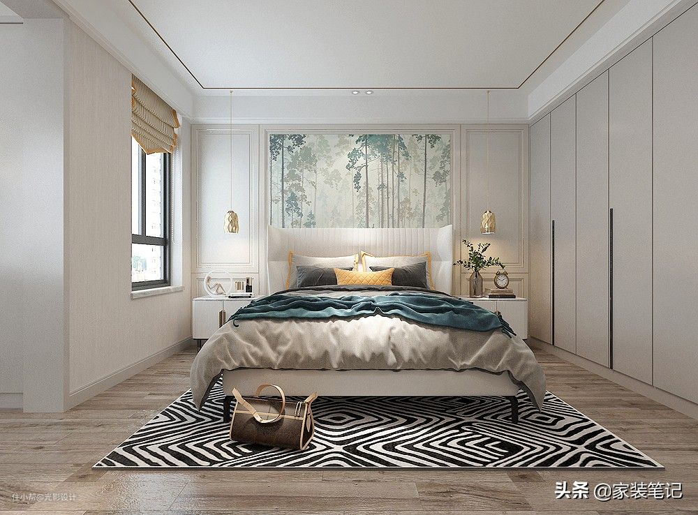 床头背景壁画是整个卧室的颜值担当,衣柜做了假墙之后,形成了嵌入式的设计,软装色彩的暖黄色让整个卧室的色彩变得丰富起来,给人第一眼就很惊艳。