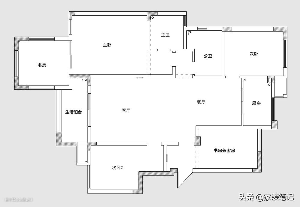 平面结构图做了不大的调整,因为原本就比较周正,所以不需要去“大动干戈”了,在细节之处进行微调就可以了,让房子的结构变得利用率更高;保留了四间卧室,还有一间主卧室做了套房,带主卫和书房的空间,十分舒适;除了两间次卧室之外,还有一间书房兼客房。