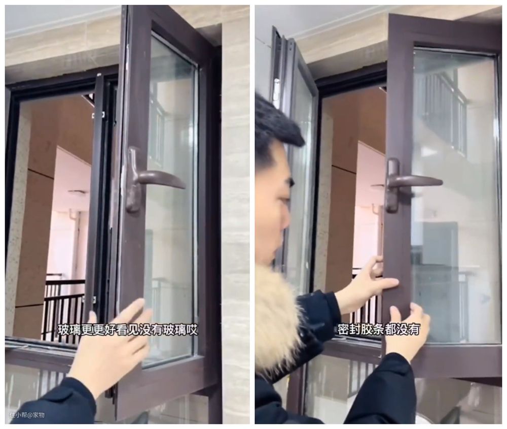厨房的玻璃,同样非常离谱,玻璃差不多就是直接放在了窗框里,四周连密封胶都没有打,一开窗就桄榔桄榔地响,漏风不说,也容易碎裂,很不安全,看着确实是有些来气。