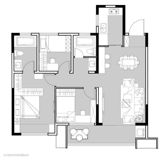 1. 功能分区,动静分区合理,私密的卧室空间和进行家庭生活的餐厅客厅在空间上区分开,睡眠和娱乐互不干扰,餐厅和客厅墙面对齐,围合成一个长方形,与分开的客餐厅相比,空间整体,感觉上更宽敞,舒适感强。双阳台相比单阳台更为宽敞,可以放置猫窝,休闲茶座等。
