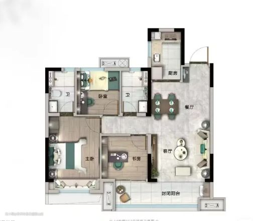 2. 书房的私密性欠佳,易受阳台干扰,同时由于有阳台遮挡,采光较差,自然光透射率不高。次卧朝北,只有反射光,没有直射阳光。