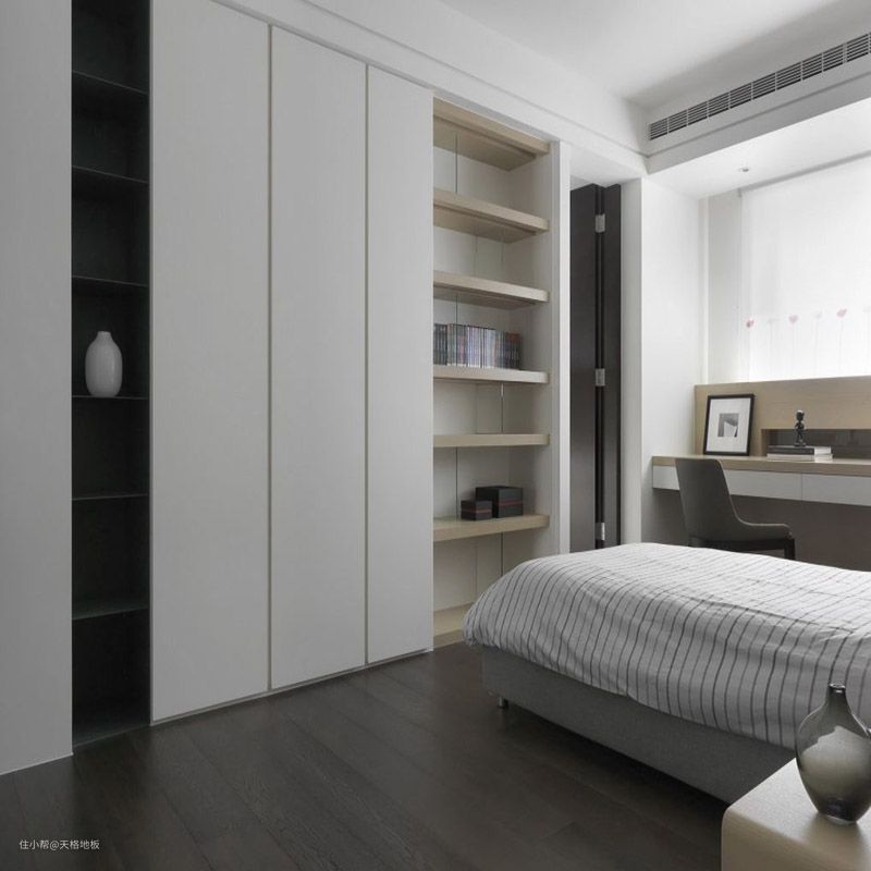 不过有一点值得注意,一些定制衣柜会非常重,直接压在木地板上会影响地板自然缩涨,导致起拱拔缝等问题,因此常常会采用先在衣柜底部装好衣柜面积内缩5-10公分的杂木地板,再装柜子,装完柜子再铺房间剩下的地板。柜子底下留了5-10公分空间地板直接插进去,既能防潮,还不影响木地板缩涨。
