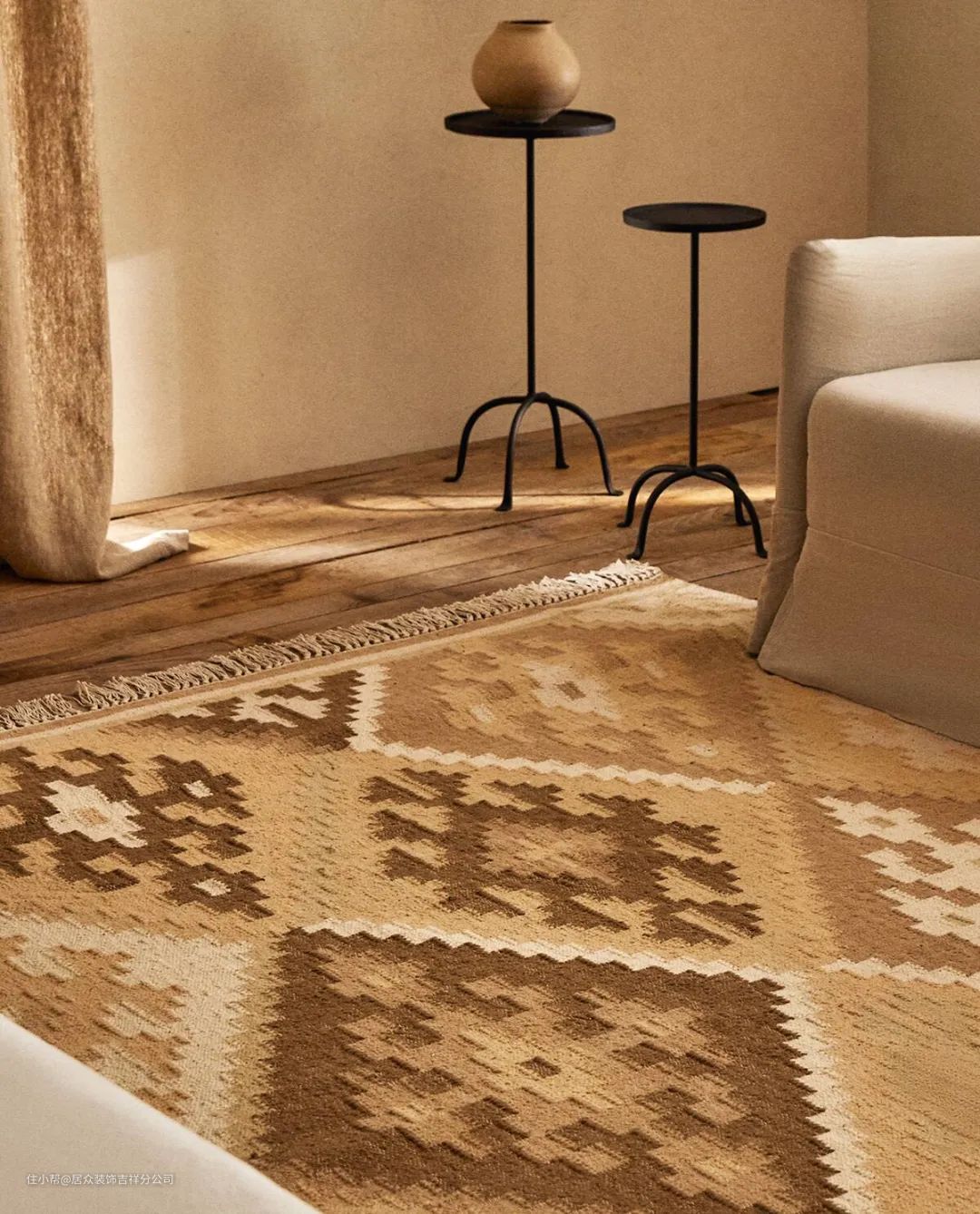 ③“棉麻地毯”是近些年非常受欢迎的款,大部分由棉、麻等原料制成,颜色天然,价格适中,透气性较好,但质地偏粗糙,搭配起来自然风十足,有种度假风的悠闲感。