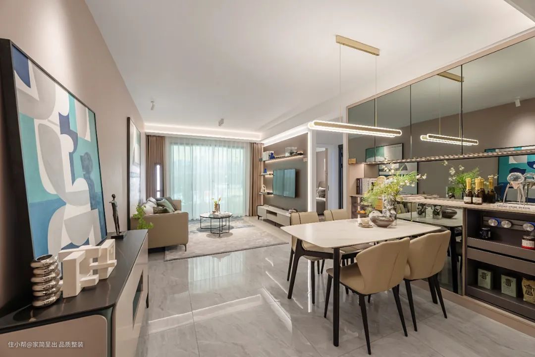新升级的装配式电视背景墙在收纳层板上预装了灯带,整体外沿灯带相比传统手工粘贴的灯带,也更加笔直、均匀,视觉上更显质感高级,空间效果提升妥妥的~