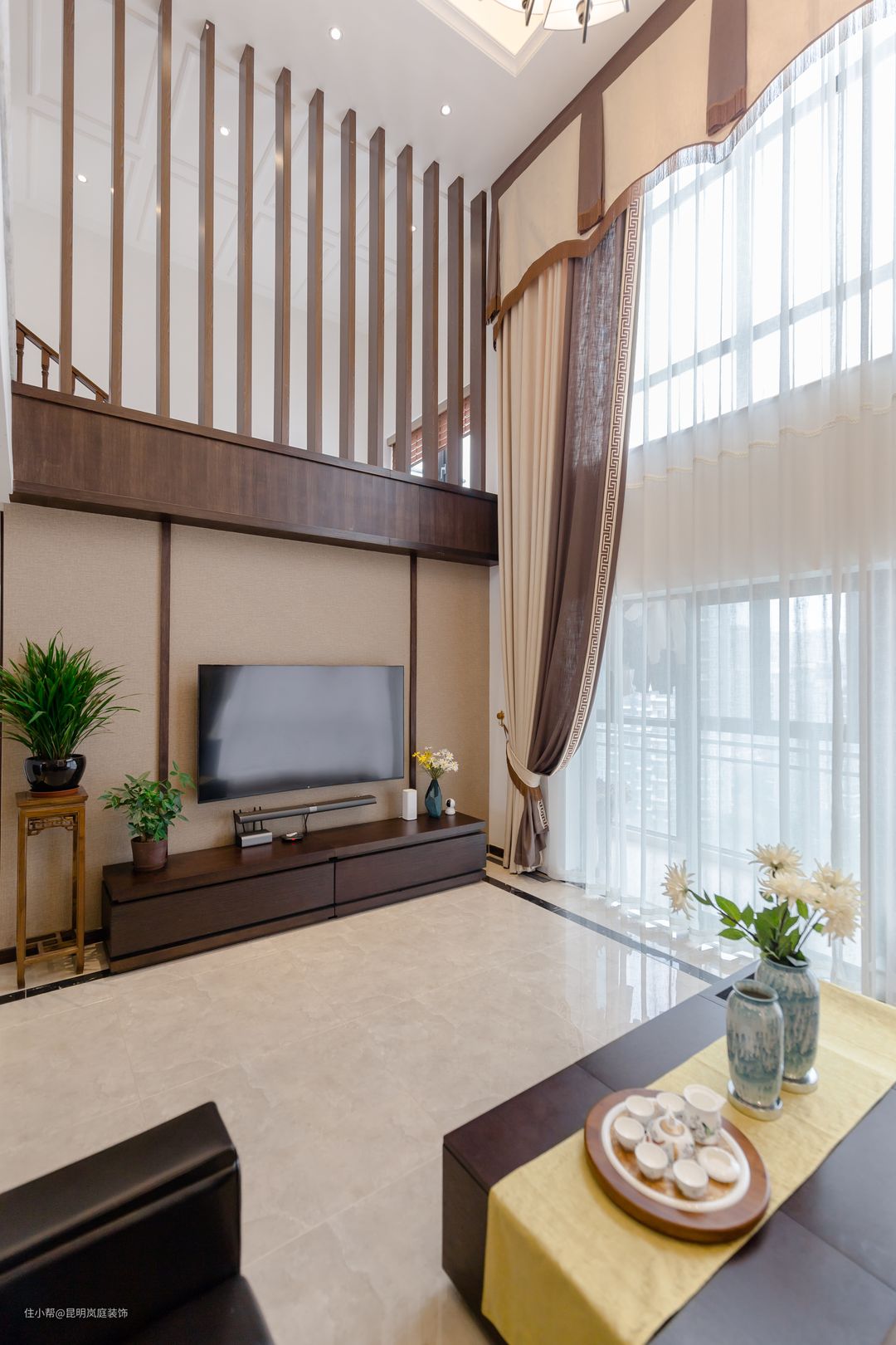 今天我们就拿一套新中式风的客厅案例为大家讲一下挑空客厅的正确设计。