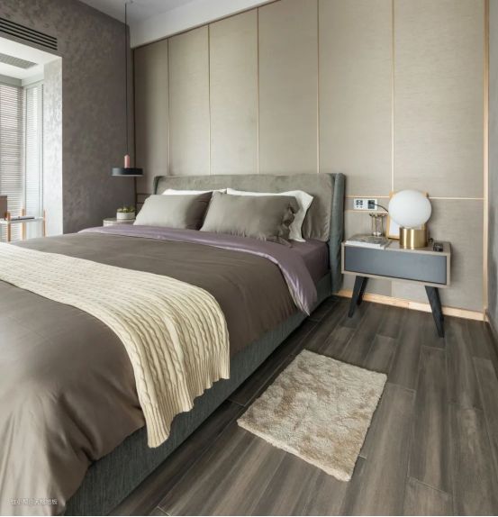 若想让卧室更加端庄成熟,那么颜色相对较深的自然木质感地板,搭配的效果就会非常的不不错,让卧室显得现代大方而又成熟端庄