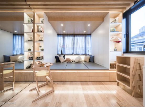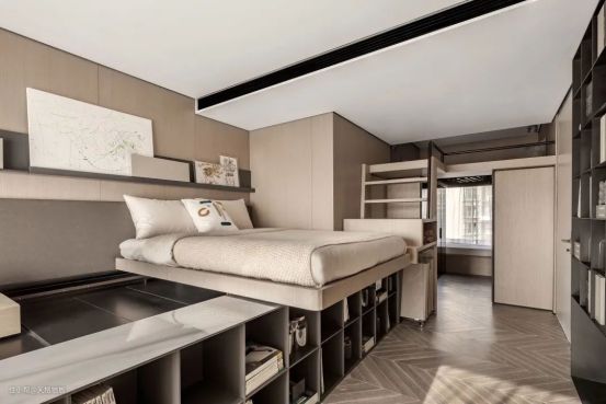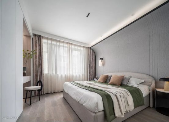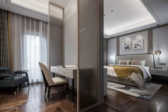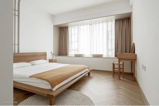 对于木色调比较强的简约卧室空间,那么搭配上浅木色木地板,整体和谐统一的质感,会让空间显得优雅自然,给人以轻松舒适的氛围感。