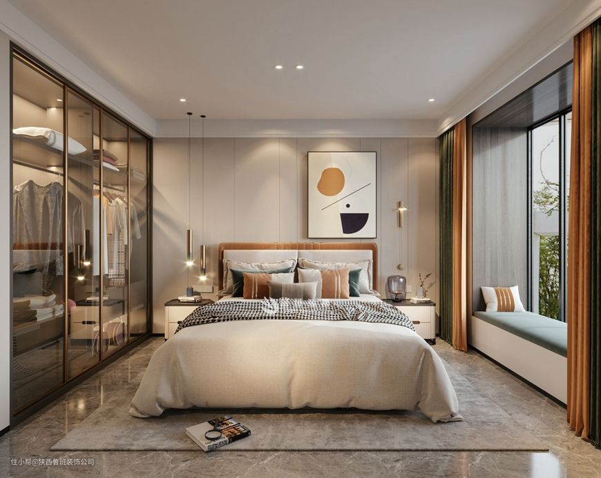 原始主卧的面积很大,设计师合理利用空间规划休息区+衣帽间+主卫的套间系统,提升居住舒适度。配色上,用金色暖搭配灰色,点缀绿色软装让空间既拥有自然气息,也成全时尚感。