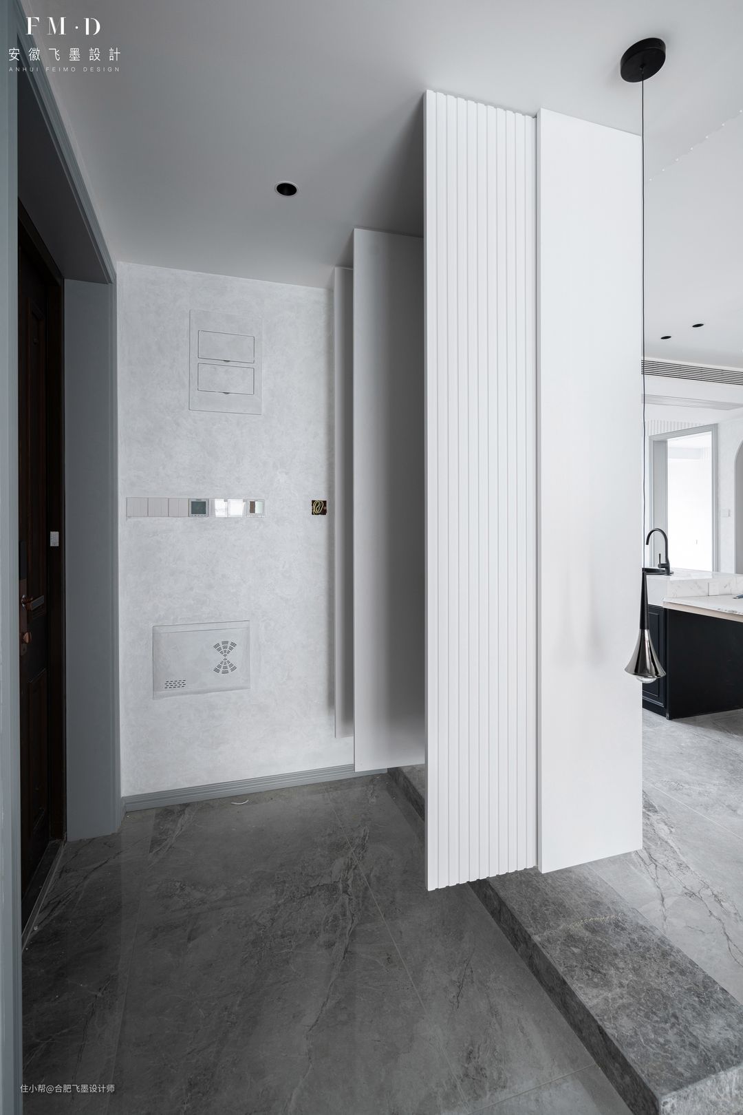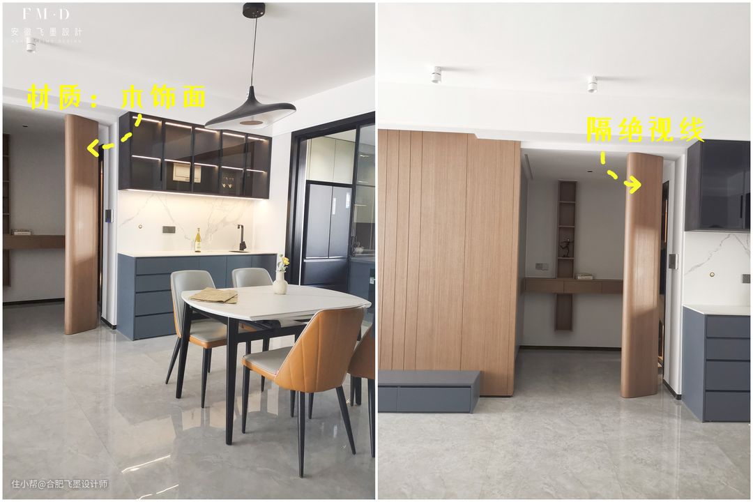 另外便是为了划分功能区了,将落尘区和室内区隔开来,保留进门的仪式感。至于通风换气方面,这根柱子和墙面是留有缝隙的,有助于保持玄关的敞亮度。