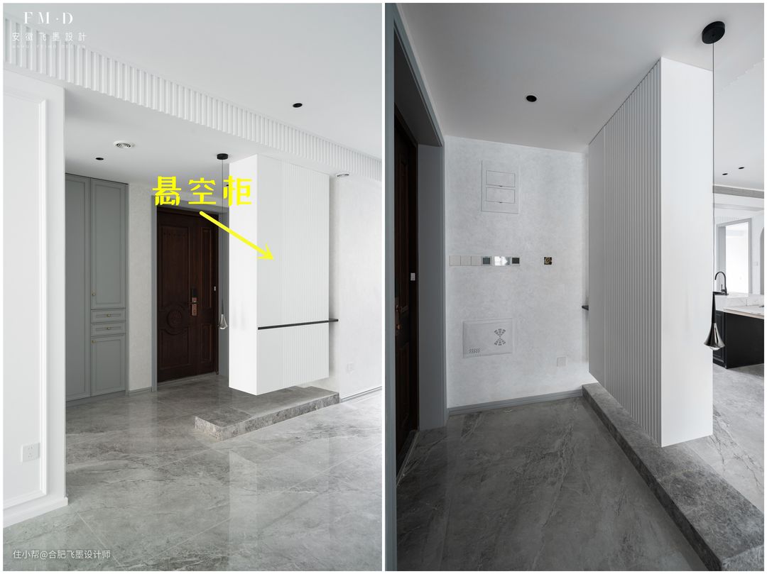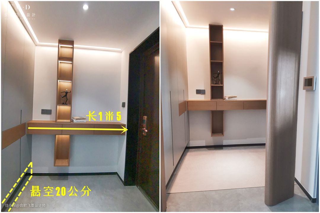 整个玄关,由3部分组成,除了屏风之外,其他空间也没有浪费,正对着入户门的是一悬空收纳柜,底部悬空20公分,放鞋子正正好。