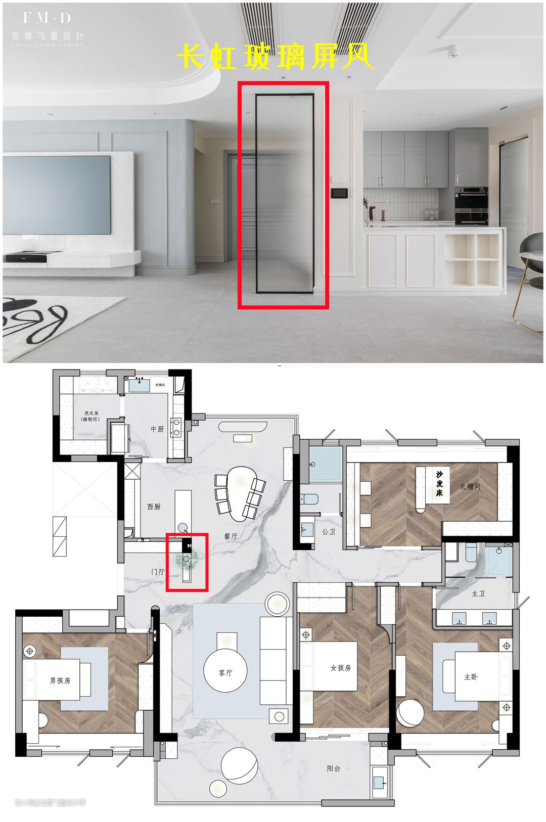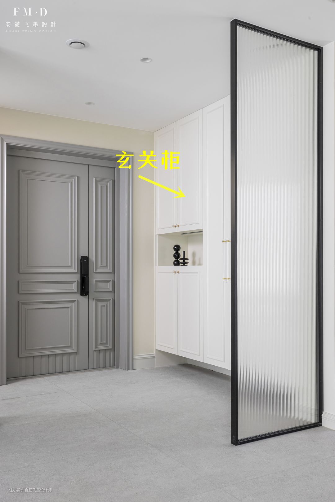 当然打造玄关屏风,绝对不止这一种做法,【蒙城碧桂园】这家选择了长虹玻璃屏风▼