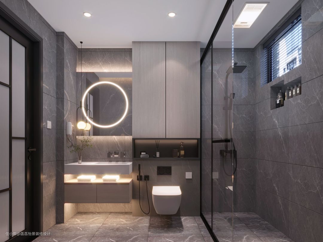 卫生间整体采用灰色调,灰色的墙地砖搭配着浅灰色的定制柜子,白色的洁具马桶,给人带来干净舒适的氛围。