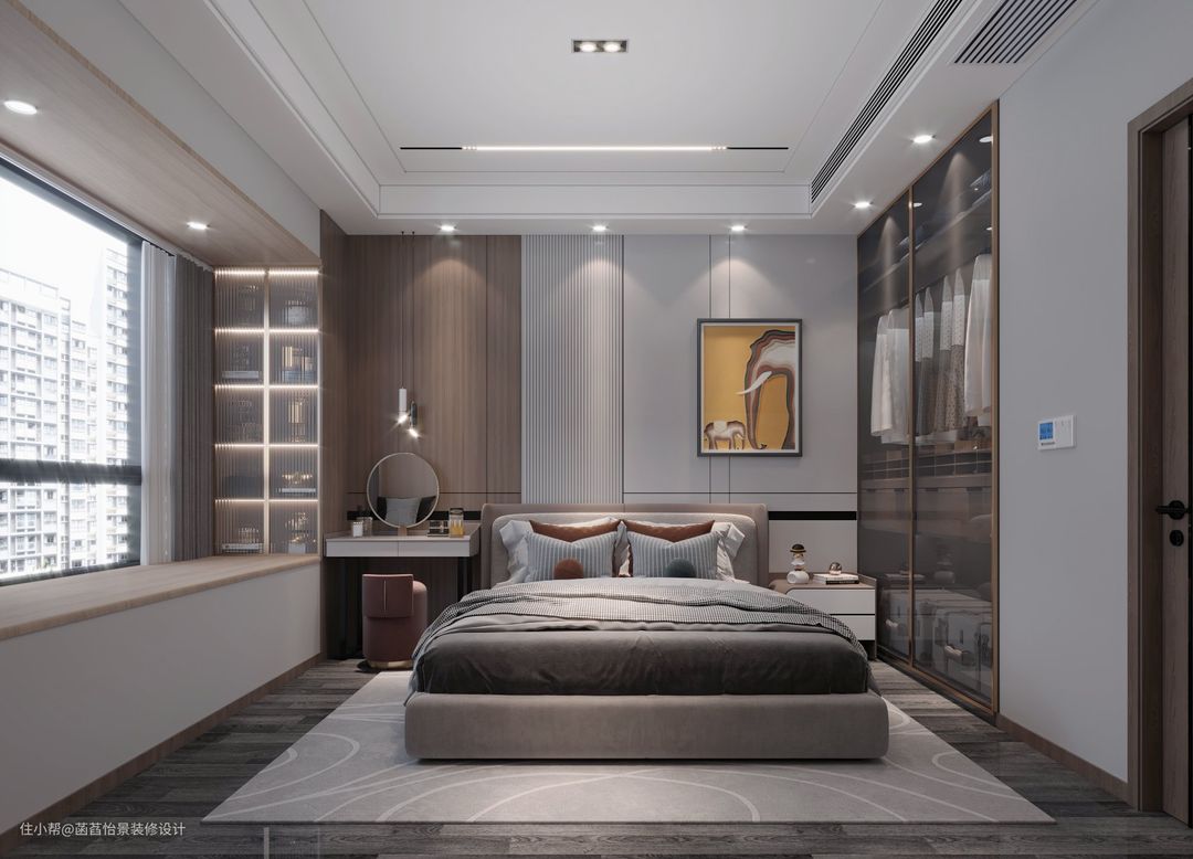 主卧的空间简单精致,床头一侧的定制梳妆台,与一面墙的定制收纳柜,都满足了女主人日常的需求。深木色的地板与灰色调的床品软装,让整个休息区都素雅而舒适