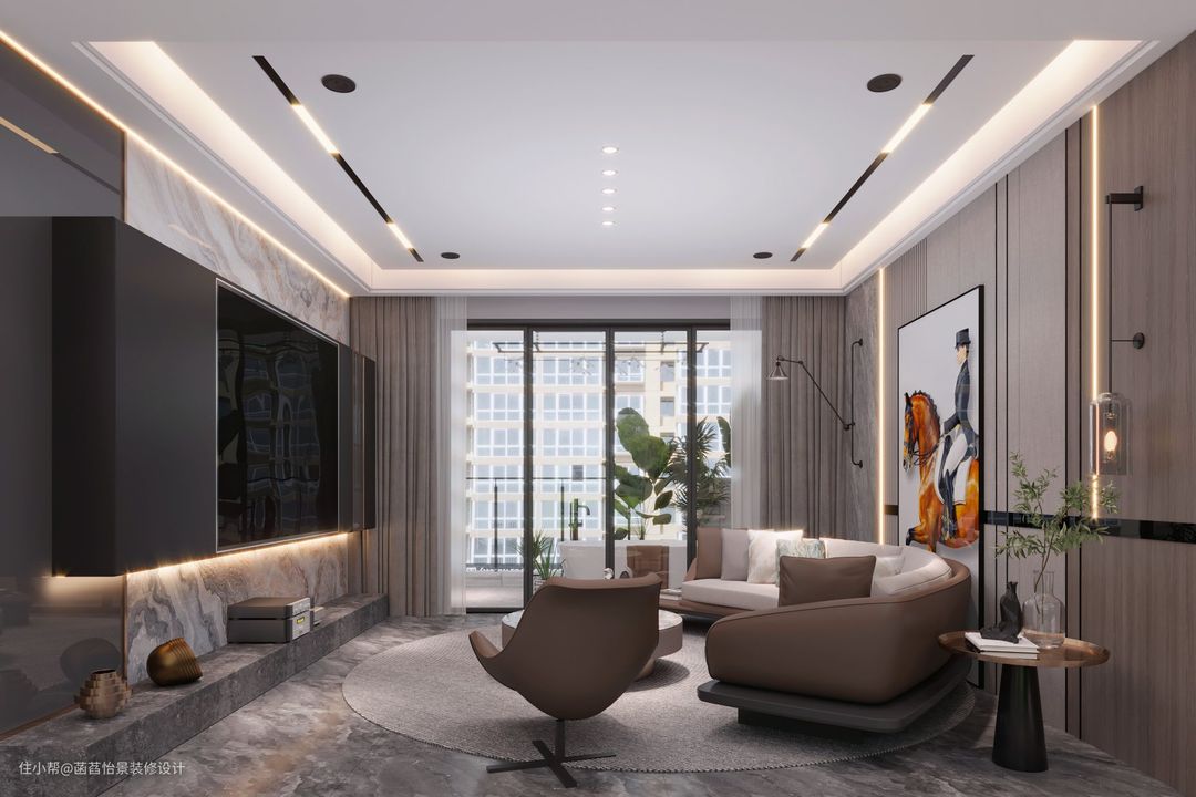 客厅采光极好,所以在整体色调的选择上,根据居住者的喜爱选着了深灰色与木色进行搭配,顶部不装吊灯,用灯带与筒灯进行空间照明与氛围的营造。定制的电视背景墙不仅美观而且十分大气。