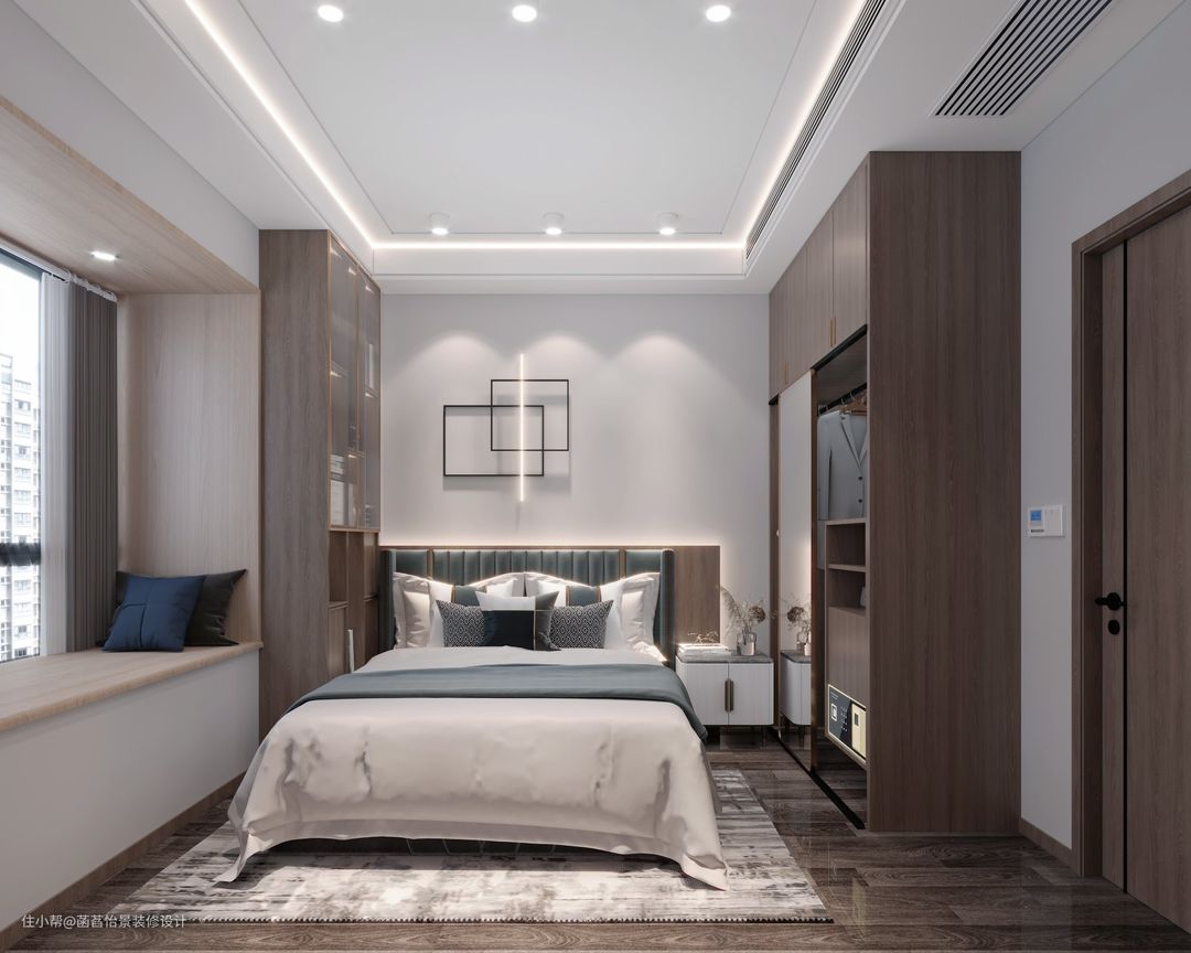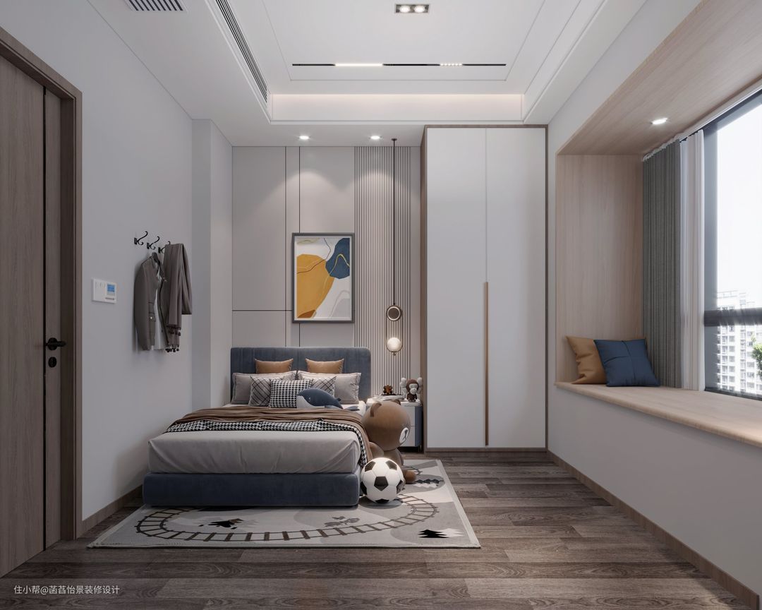 次卧的空间不算大,所以只做了一个床头柜,另一侧定制了一方到顶的柜子,满足日常的收纳,飘窗台是不可拆的,所以只能安排上飘窗垫,作为休闲区使用。