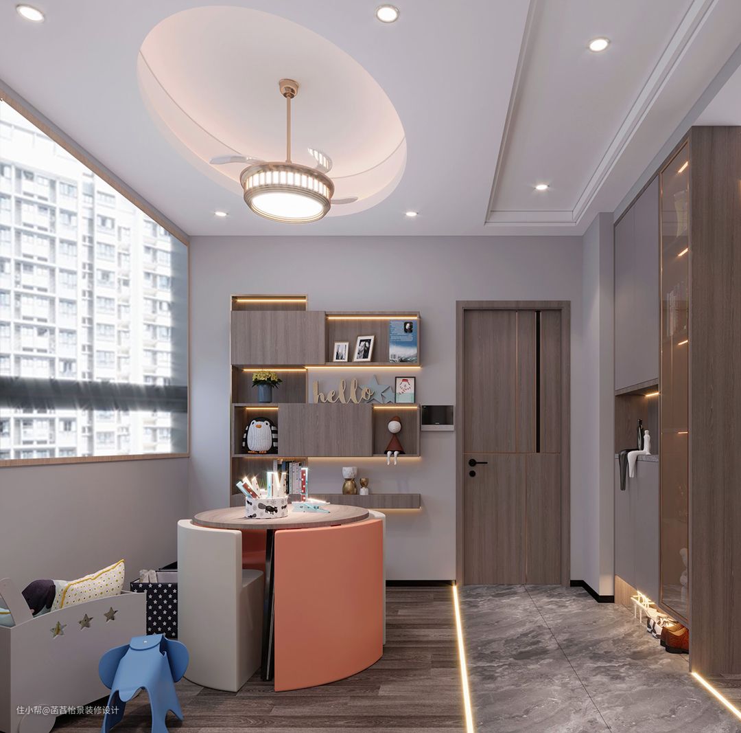 入户的空间做了一个孩子的休闲娱乐区,定制的收纳柜中部与底部留空设计,方便出入门使用,娱乐区可以收纳的小桌椅,可以满足孩子日常的使用。
