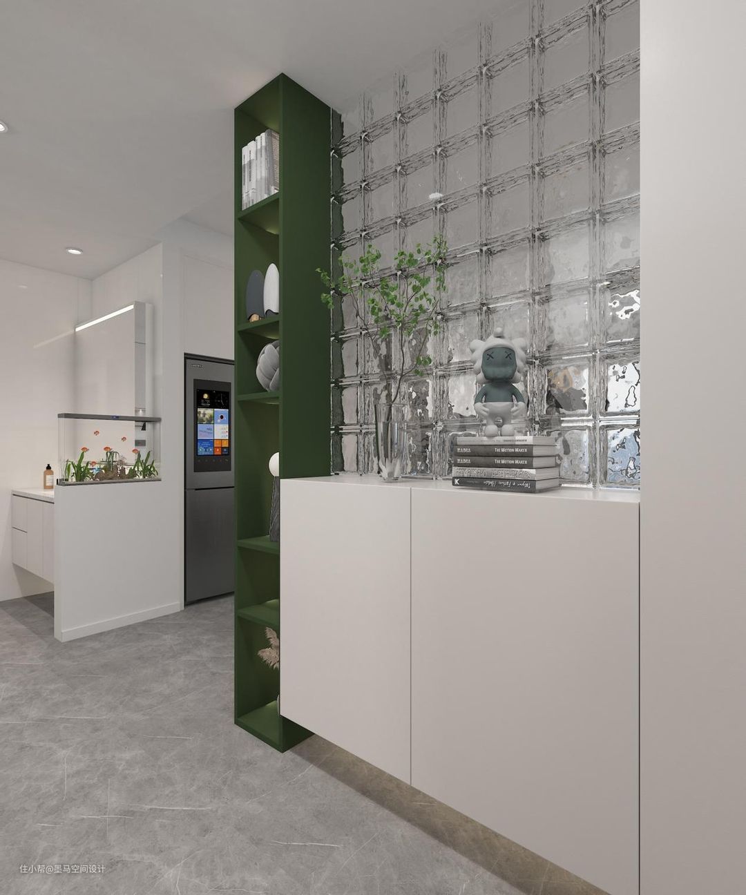 玻璃砖的使用比较灵活,用途多,不同规格的玻璃砖组合能呈现出不同的空间美感,既能解决防潮湿问题,又有朦胧的含蓄美。