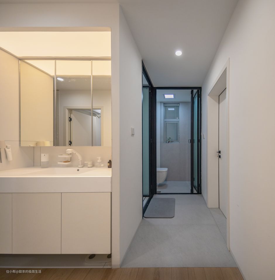 家里只有一个卫生间,为了缓解早高峰期的使用压力,设计师做了三分离式的处理,洗手台、马桶间和淋浴间各自独立,使用时互不打扰。