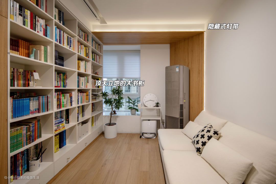 客厅和儿童房之间的墙体,向客厅移动了60公分,缩短了客厅的面宽。为了不影响客厅的空间感,设计师取消了茶几,并按照女主人的要求,在客厅定制了满墙大书柜。