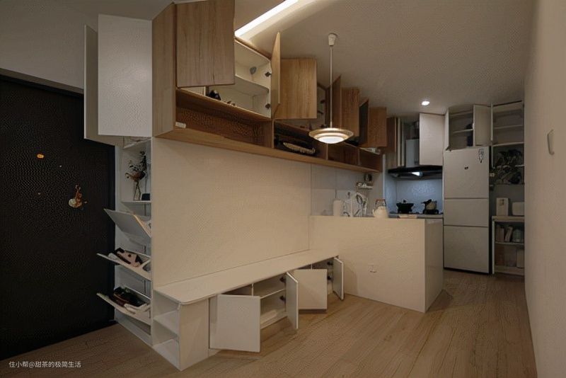 ③在餐厅定制卡座,上方做吊柜、侧面做鞋柜,打造丰富的储物空间。