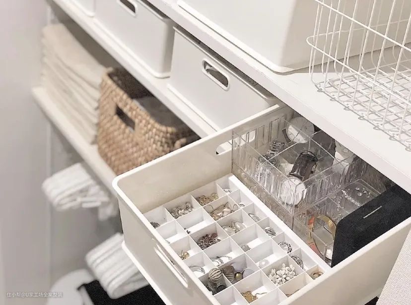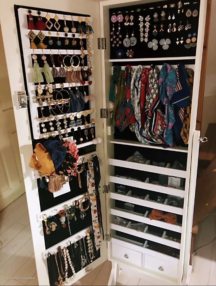饰品、丝巾除了款式众多外,最大的特点就是小而薄。所以对于饰品的收纳方式,需要的是“面广”,而非“进深”。只要有足够大的面,能一一铺开所有的装饰品就够了。至于进深,只要能存放进物品就够用了。