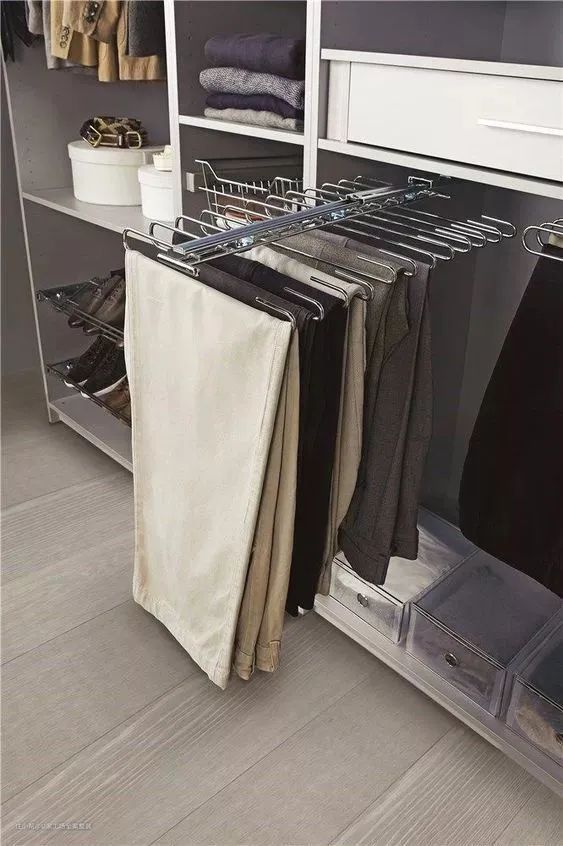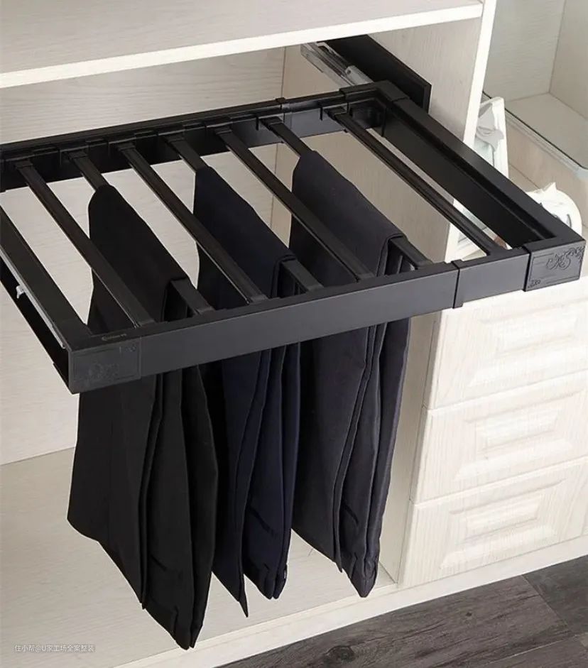 裤挂区建议采用纵向伸缩挂杆,一是相对传统挂杆更方便拿取,二是可以针对不同宽度的裤子设置收纳区域,最大化利用空间。
